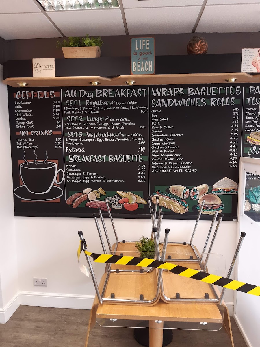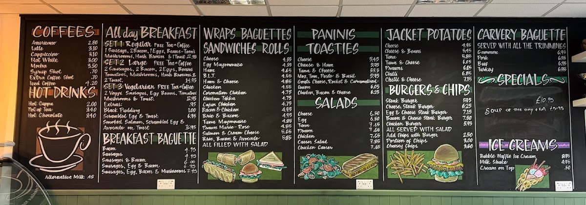 Sandwiches and Rolls feature a range of fillings including Cheese & Ham, Tuna & Cheese, Mozzarella with Tomato, Pesto & Basil, and Chicken, Bacon & Cheese, all priced at £6.25. These are suitable for quick lunches or light meals.